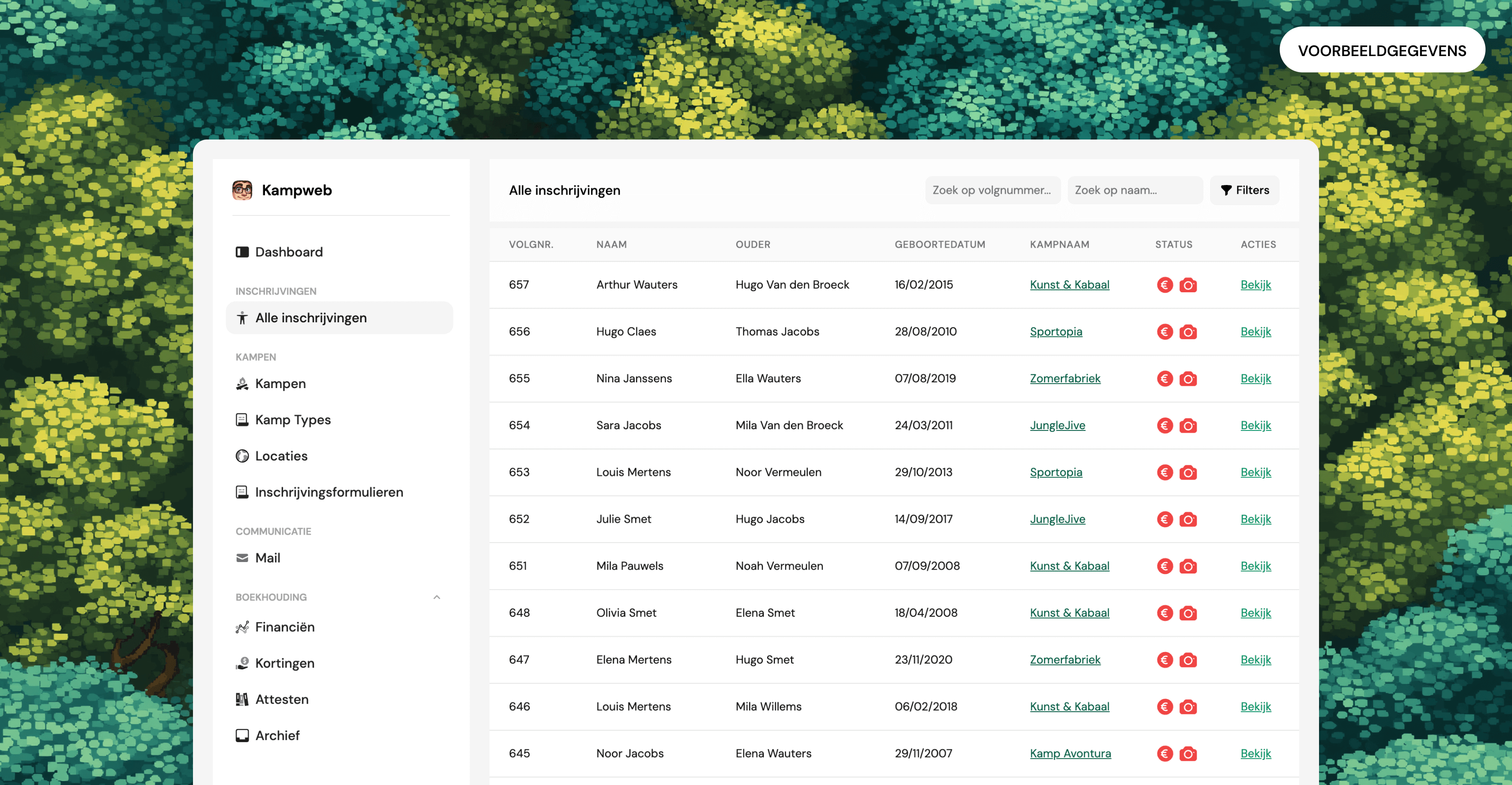 Je hoeft niets manueel bij te houden — inschrijvingen komen automatisch in je overzicht terecht. Alles wordt veilig bewaard en gekoppeld aan het juiste kamp.